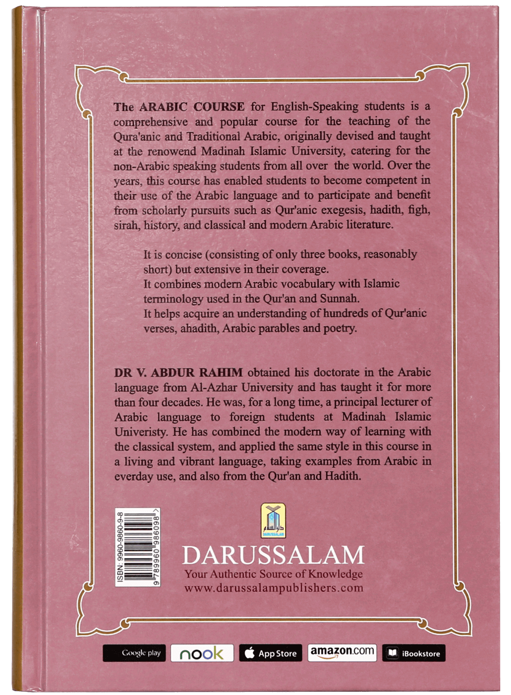 The ARABIC COURSE for English- speaking students is a comprehensive and popular course for the teaching of the Qura’anic and traditional Arabic, originally devises and taught at the renowned Madinah Islamic University, catering for the non- Arabic speaking students from all over the World. Over the years, this course has enabled students to become competent in their use of the Arabic language and it participates and benefit from scholarly pursuits such as Qura’anic exegesis, Hadiths, Fiqh, Sirah, History, and classical and modern Arabic literature. It is concise but comprehensive in their coverage. It combines modern Arabic vocabulary with Islamic terminology used in the Qur’an and Sunnah. It helps acquire an understanding of hundreds of Qura’anic verses, Ahadiths, Arabic Parables, and poetry.