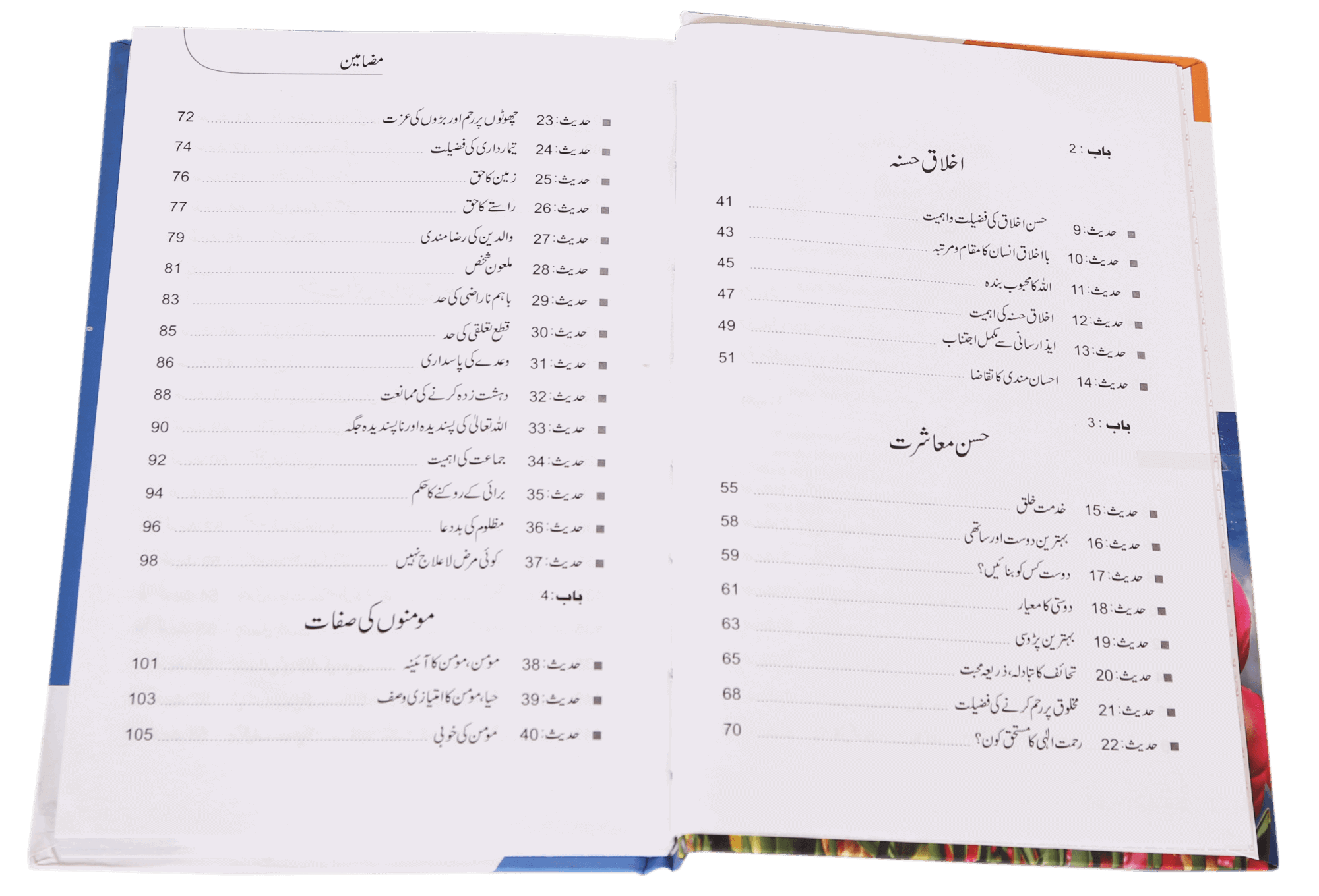 کتاب کی بارہ ابواب میں تقسیم کی گئی ہے ابتدائی ابواب میں خشیت الہی اور اتباع رسول کا درس دیا گیا ہے جبکہ دیگر ابواب میں فضیلت قرآن، حسن معاشرت، اخلاق حسنہ اور صفات المؤمن کا تذکرہ کرتے ہوئے نیکی وبدی میں امتیاز کی تعلیم کے ساتھ ساتھ حسن عمل کی تعلیم اور ترغیب پرروشنی ڈالی گئی ہے-فی الجملہ یہ کتاب مستند احادیث کی روشنی میں صحیح اسلامی زندگی کی جامع دستاویز ہے