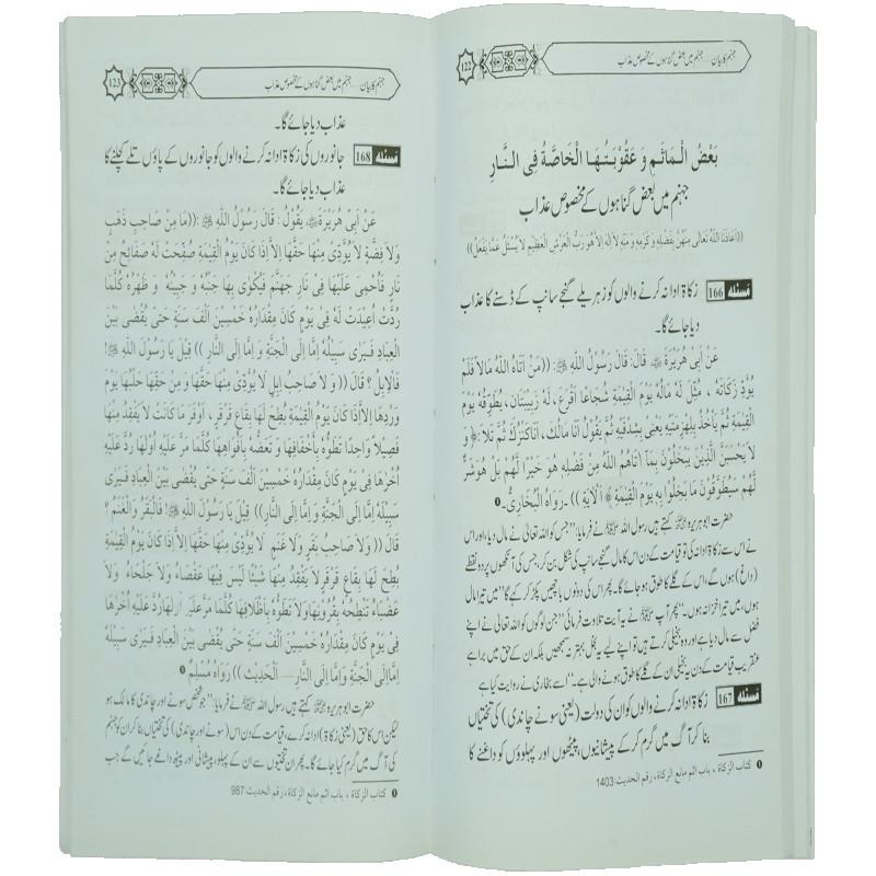 اس کتاب میں جہنم کے وجود کا ثبوت، جہنم کے دروازے اور درجات، ہلکا ترین عذاب، آگ کی شدت، اہل جہنم کا کھانا پینا، لباس، بستر، چھتریاں، قناتیں، ہتھکڑیاں اور بیڑیاں، نیز جہنم میں لوہے کے ہتھوڑوں، گرزوں، سانپوں اور بچھوؤں، زہریلی گیس اور زہریلے دھوئیں کے عذابوں کا ذکر قرآن مجید اور احادیث صحیحہ کے حوالے سے کیا گیا ہے۔