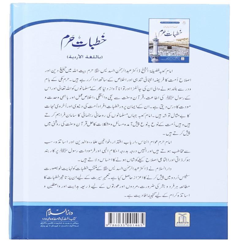 زیرِ نظر کتاب "خطباتِ حرم" فضیلۃالشیخ ڈاکٹرعبدالرحمٰن السدیس کے بیت اللہ میں دیے گئے خطباتِ جمعہ میں سے منتخت کتاب کا اردو ترجمعہ ہے۔ تعمیرِ سیرت کے لیے اس کتاب کا مطالعہ ہر فرد چاہے عورت ہو یا مرد سب کے لیے مفید اور زریعہ ہدایت ہے