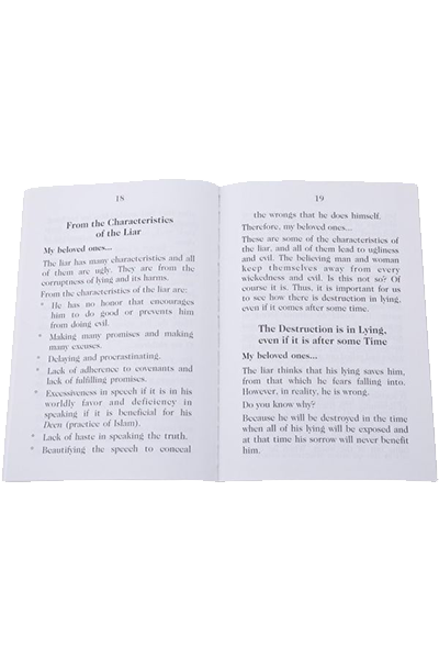 Lying is from the characteristics of the people of the Hell-fire, and the losers in this life and the Hereafter. Lying is degrading and humiliating for the one who practices it and it will carry him to destruction. Lying is the cause of every evil, it is the key to corruption and it brings the anger of the people upon its practitioner. We will learn in this book about that which decreases our Faith. Thus, we will learn about the recompense of the liar and the corruptness of lying. This is so that we do not fall into it, that we may be cautious of it, and stay away from its people, and not accompany those who are liars. After reading this book, we come to hate lying and those who practice lying. Also, every one of us will increase in Faith by adhering to truthfulness in all the affairs of this life, with our parents, our brothers, our neighbors, our friends, and with all of mankind. Thus, we must know about the danger of lying and the punishment of the liars so that we may be of the people of truth, and with those who practice truthfulness.