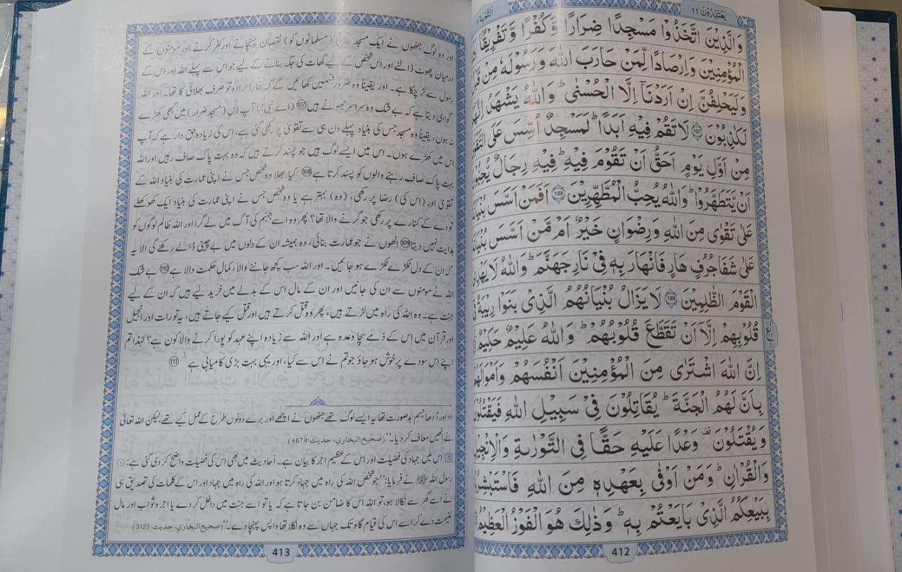 Large size of the acclaimed Tafsir Ahsanul Kalam. Quran with Arabic in bold Indo-Pak/Persian script on right side of each page (15 lines/pg) with Urdu translation & tafsir footnotes on the left side of each page.