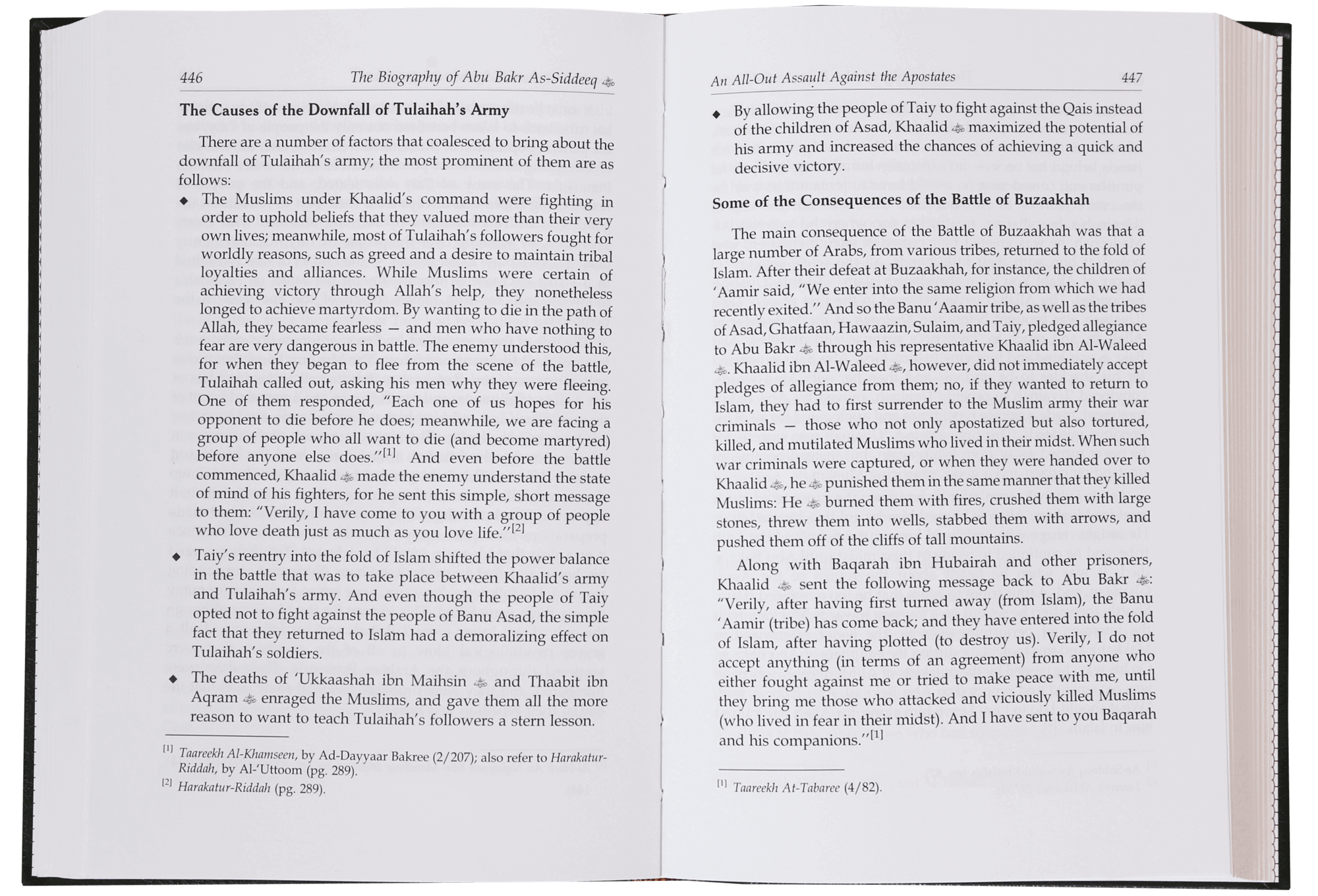 From the day he embraced Islam until the day he died, Abu Bakr As-Siddique (May Allah be pleased with him) was the ideal Muslim, surpassing all other Companions in every sphere of life. During the Prophet`s lifetime, Abu Bakr was an exemplary soldier on the battlefield; upon the Prophet`s death, Abu Bakr (May Allah be pleased with him) remained steadfast and, through the help of Allah, held this nation together. When others suggested keeping Usaamah`s army back, Abu Bakr insisted - and correctly so - that the army should continue the mission which the Prophet (Peace and Blessings of Allah be upon him) had in mind. When people refused to pay Zakat, and when the apostates threatened the stability of the Muslim nation, Abu Bakr (May Allah be pleased with him) was the one who remained firm and took decisive action against them. These are just some of the examples of Abu Bakr`s many wonderful achievements throughout his life. I have endeavored to describe all of the above in a clear and organized manner. But more so than anything else, I have tried to show how Abu Bakr`s methodology as a Muslim and as a ruler helped establish the foundations of a strong, stable, and prosperous country - one that began in Al-Madeenah, extended throughout the Arabian Peninsula, and then reached far-off lands outside of Arabia. Throughout the brief period of his caliphate (about 2 years), Abu Bakr As-Siddiq (May Allah be pleased with him) faced both internal and external challenges; the former mainly involved quelling the apostate factions of Arabia and establishing justice and peace among the citizens of the Muslim nation; and the latter mainly involved expanding the borders of the Muslim nation by spreading the message of Islam to foreign nations and conquering those nations that stood in the way of the propagation of Islam. During the era of his caliphate, Khalifah Abu Bakr As Siddeeq (May Allah be pleased with him) sent out armies that achieved important conquests; for example, under the command of Khalid ibn Al-Waleed (May Allah be pleased with him), the Muslim army gained an important victory in Iraq. And the Muslim army achieved other important victories under the commands of Al-Muthannah ibn Haarithah (May Allah be pleased with him) and Al-Qa`qaa ibn `Amr (May Allah be pleased with him). In short, the victories achieved during the era of Abu Bakr`s Caliphate paved the way for victories that later took place after Abu Bakr`s death. I have tried to analyze the above-mentioned conquests and to break down the reasons why they were such monumental successes. I particularly pointed out Abu Bakr`s contributions to those conquests: His military strategy, the leaders he chose, the letters through which he communicated with them, and so on.