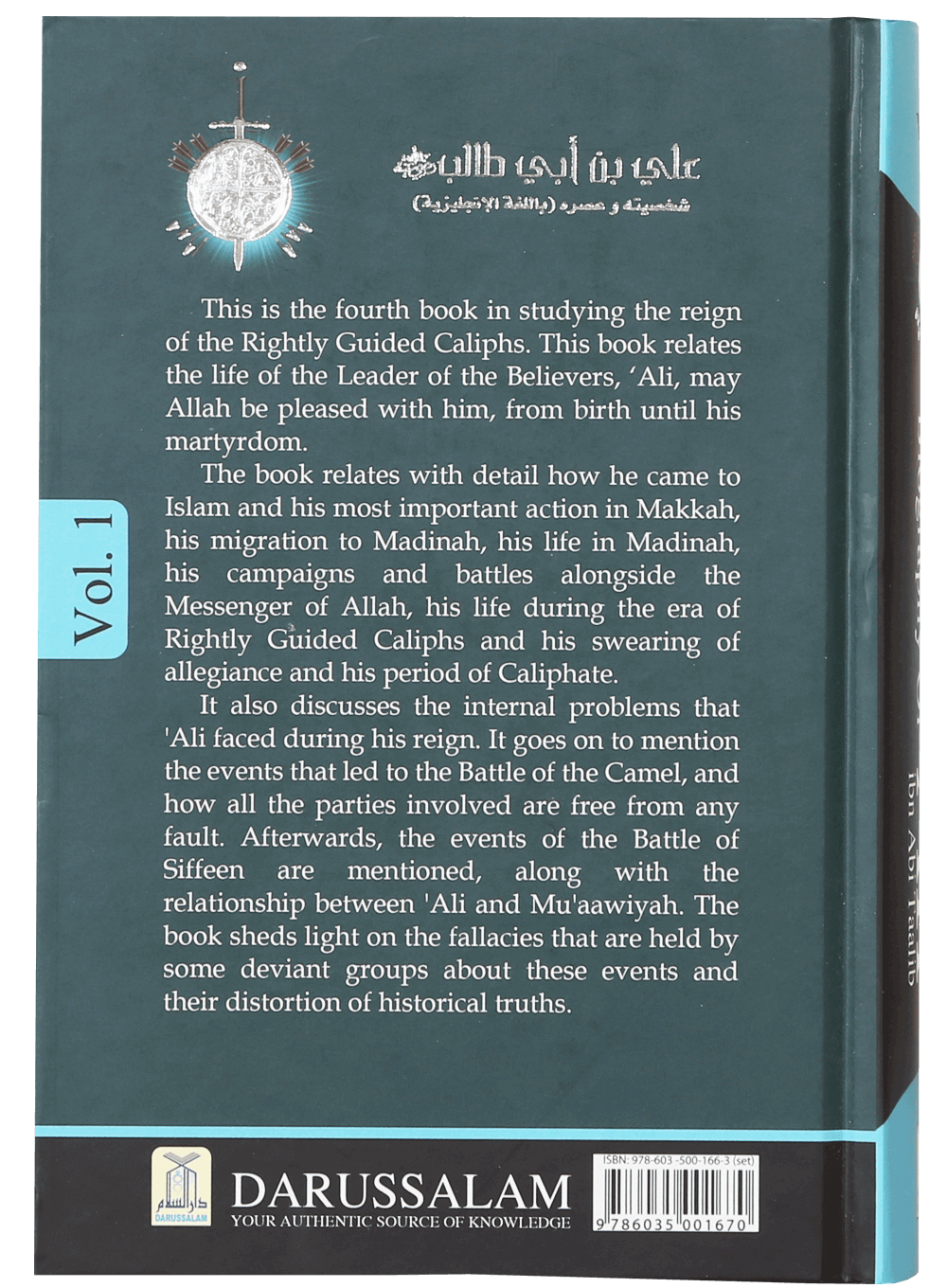 This is the fourth book in studying the reign of the Rightly Guided Caliphs. It relates the life of the Leader of the Believers, `Ali, may Allah be pleased with him, from birth until his martyrdom. The book relates with detail how he came to Islam and his most important actions in Makkah, his migration to Madinah, his life in Madinah, his campaigns and battles alongside the Messenger of Allah, his life during the era of Rightly Guided Caliphs and his swearing of allegiance and his period of Caliphate. It also discusses the internal problems that `Ali faced during his reign. It goes on to mention the events that led to the Battle of the Camel, and how all the parties involved are free from any fault. Afterward, the events of the Battle of Siffeen are mentioned, along with the relationship between `Ali and Mu`aawiyah. The book sheds light on the fallacies that are held by some deviant groups about these events and their distortion of historical truths.