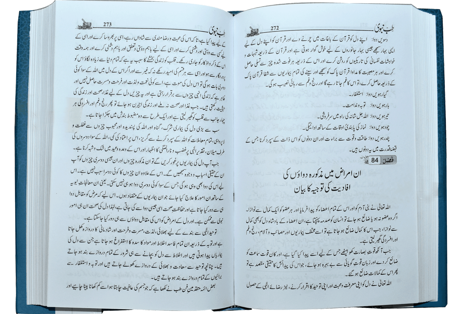 زیرِنظر کتاب میں مختلف اشیاء کے خواص، فوائد اور استعمال کے طریقے بیان کیے گئے ہیں۔اس کے علاوہ مختلف روحانی وجسمانی امراض کے علاج کے لیے قران وحدیث سے منتخب دعاوَں کا ذکر ہے، مزید برآں بعض تجربات ومشاہدات کی روشنی میں چند دعاوَں اور اذکار کے اثرات وفوائد کا ذکر بھی کیا ہے،گویا یہ کتاب طبِ نبوی پر ایک شہکار `اسائیکلوپیڈیا آف طب اسلامی` ہے۔پیغمبر اسلام صلی اللہ علیہ وسلم نے اپنی حیات میں جہاں روحانی اور باطنی بیماریوں کے حل تجویز فرمائے وہیں جسمانی اور ظاہری امراض کے لیے بھی اس قدر آسان اور نفع بخش ہدایات دیں کہ دنیا چاہے جتنی بھی ترقی کر لے لیکن ان سے سرمو انحراف نہیں کر سکتی۔ زیر نظر کتاب حافظ ابن قیم کی شہرہ آفاق تصنیف ’زاد المعاد فی ہدی خیر العباد‘ کے ایک باب ’الطب النبوی‘ کا علیحدہ حصہ ہے جسے ایک کتاب کی شکل میں الگ سے طبع کیا گیا ہے۔ مولانا کا کہنا ہے کہ بہت سے لوگ دعا اور دوا کے سلسلے میں افراط کا شکار ہیں لیکن یہ دونوں نقطہ ہائے نظر تعلیمات نبوی صلی اللہ علیہ وسلم سے میل نہیں کھاتے بیماری کے علاج کے لیے دعا اور دوا دونوں از بس ضروی ہیں