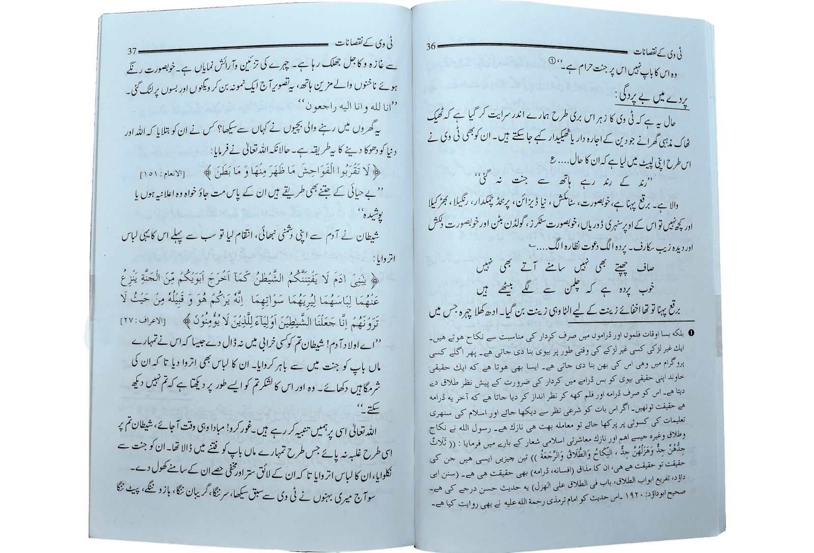 زیرِنظر کتابچہ`ٹی وی کے نقصانات` میں ٹی وی کے بظاہر دلفریب اور معلومات افزا پردہّ سیمیں جے پس پردہ نہایت تلخ اور بے حد زہریلے حقائق کی دردمندانہ اسلوب میں نقاب کشائی کی گئی ہے