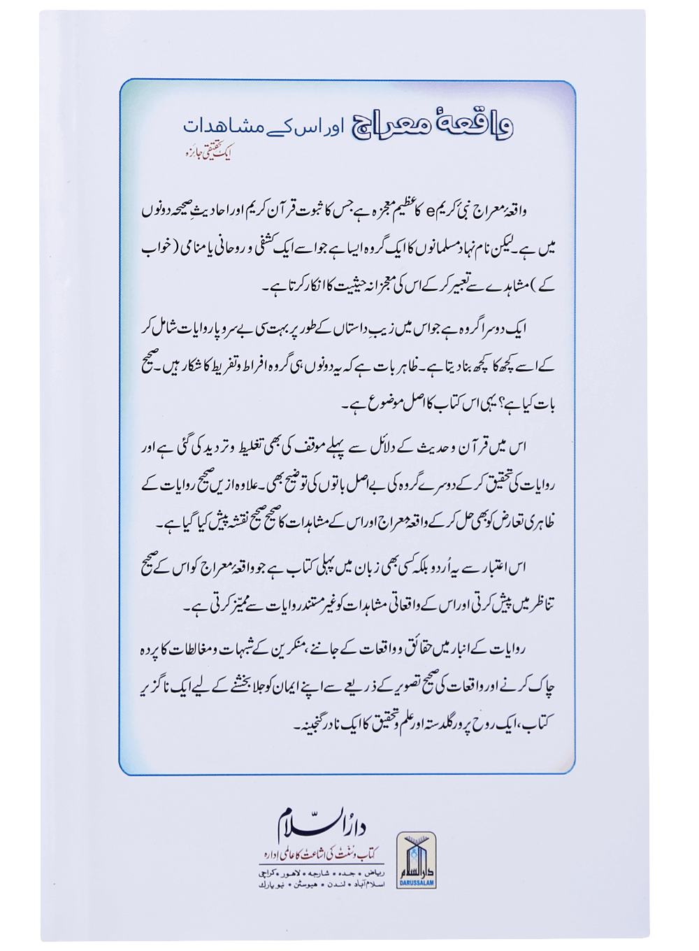 واقعۂ معراج نبی کریم صلی اللہ علیہ وسلم کا عظیم معجزہ ہے جس کا ثبوت قرآن کریم اور احادیث صحیحہ دونوں میں ہے۔ لیکن نام نہاد مسلمانوں کا ایک گروہ ایسا ہے جو اسے ایک کشفی و روحانی یا منامی (خواب کے)مشاہدے سے تعبیر کر کے اس کی معجزانہ حیثیت کا انکار کرتا ہے۔ ایک دوسرا گروہ ہے جو اس میں زیب داستاں کے طور پر بہت سی بے سروپا روایات شامل کر کے اسے کچھ کا کچھ بنا دیتا ہے۔ ظاہر ہے کہ یہ دونوں ہی گروہ افراط و تفریط کا شکار ہیں۔ صحیح بات کیا ہے؟ یہی اس کتاب کا اصل موضوع ہے۔ اس میں قرآن و حدیث کے دلائل سےپہلے مؤقف کی بھی تغلیط و تردید کی گئی ہے اور روایات کی تحقیق کر کے دوسرے گروہ کی بے اصل باتوں کی توضیح بھی۔ اس اعتبار سے یہ اردو کی پہلی کتاب ہے جو واقعۂ معراج کو اس کے صحیح تناظر میں پیش کرتی ہے اور اس کے واقعاتی مشاہدات کو غیر مستند روایات سے ممیّز کرتی ہے۔