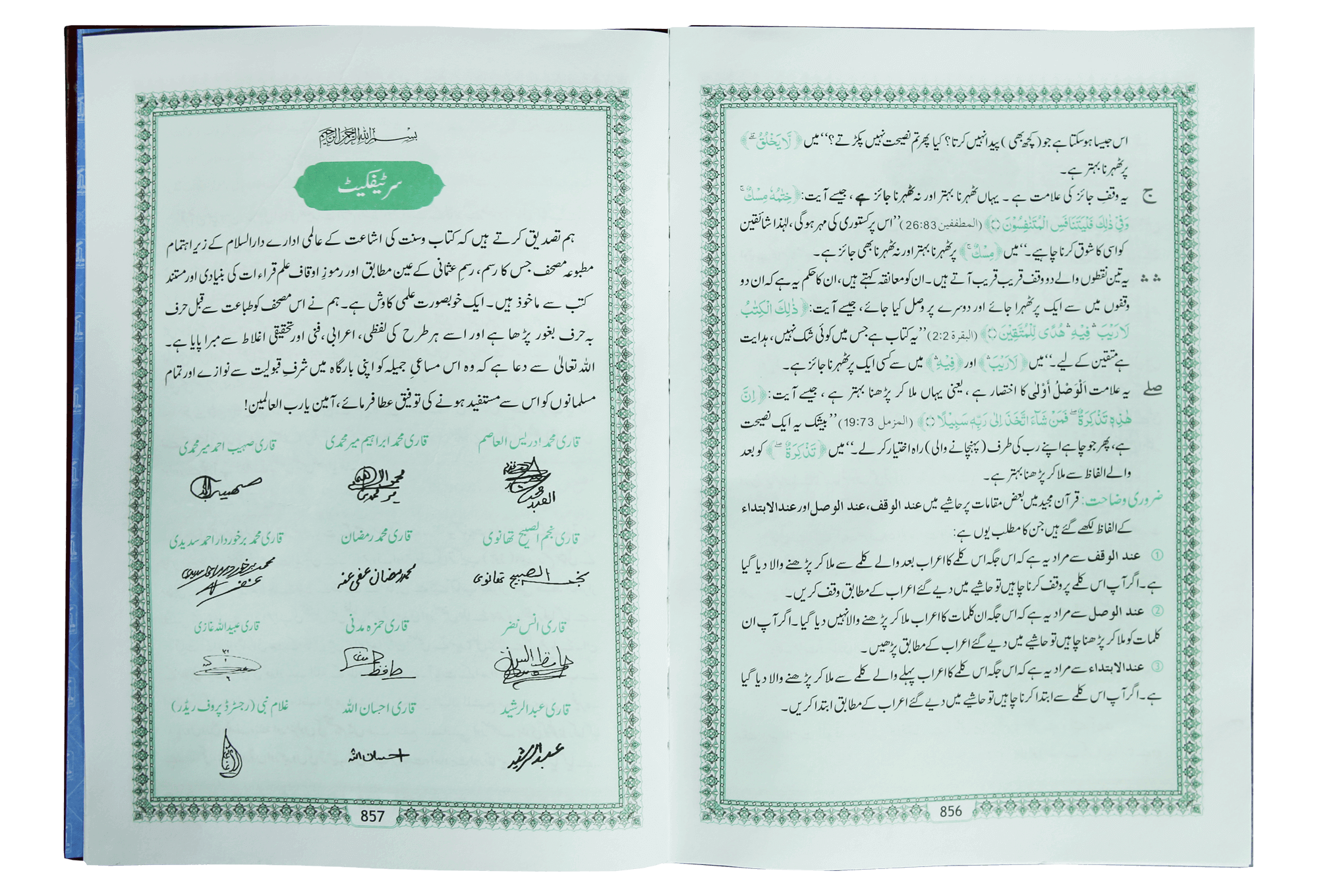 This copy of Quran has 13 line per page with beautiful green cover. Its clear and standard font made it easy to read/recite it for Muslims.