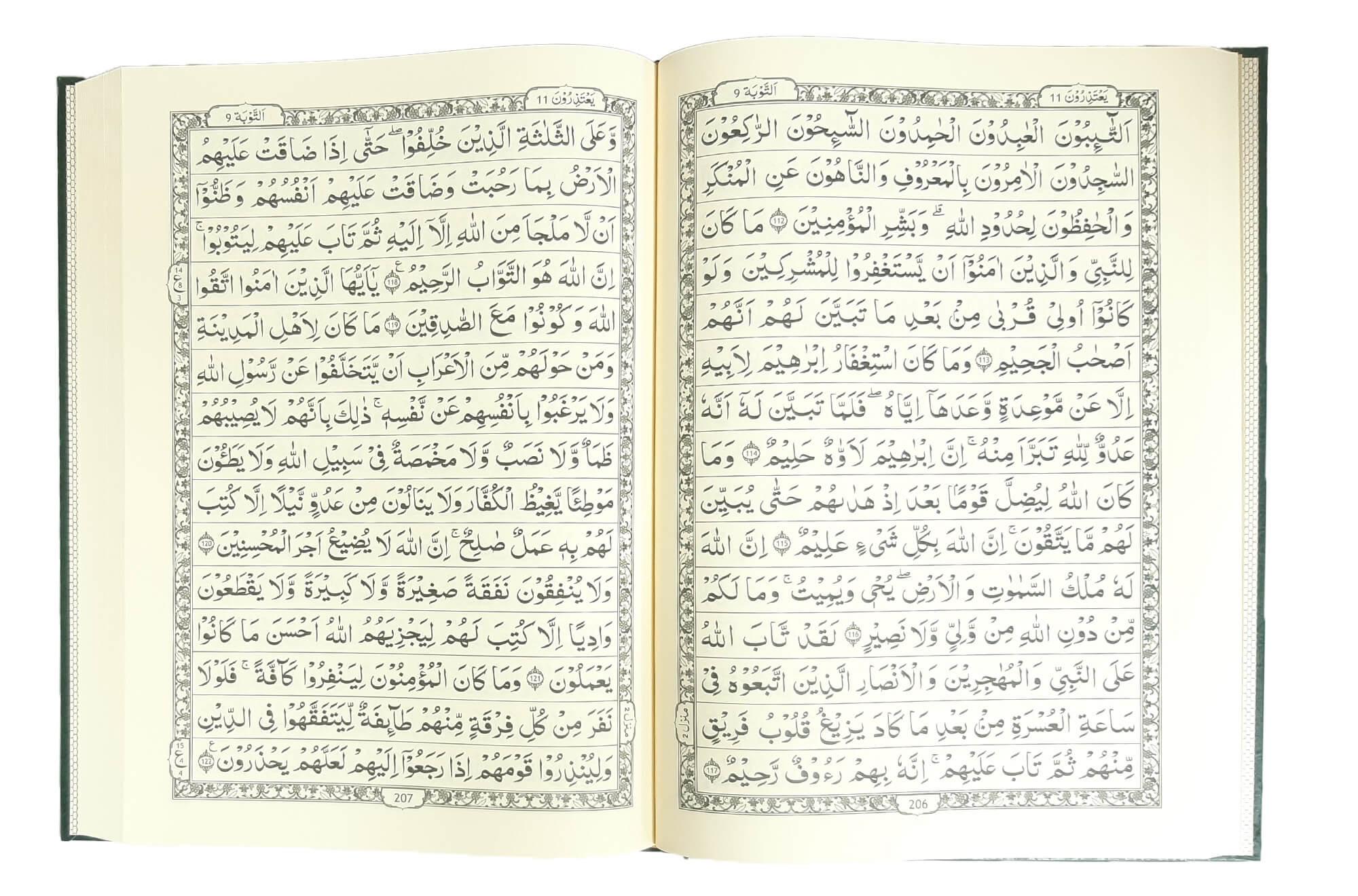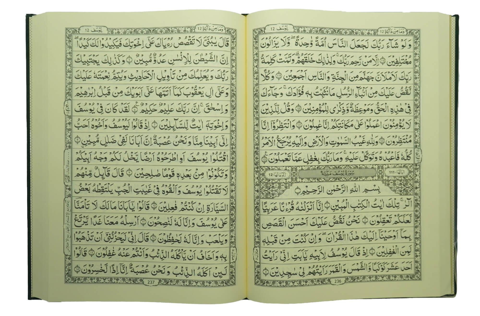 This copy of Al Quran Al Kareem has 15 lines per page with the beautiful green cover. Its clear and standard font made it easy to read/recite it for Muslims.