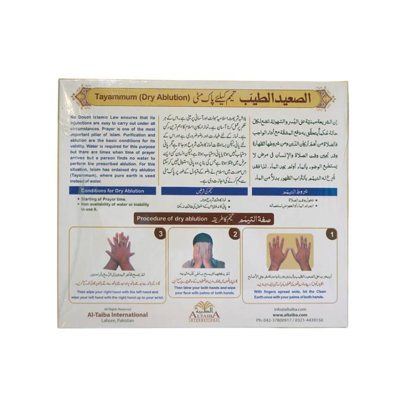 Need of All Muslims Tayammum is an Arabic word and is an Islamic act. It means to purify yourself without water. Tayammum kit is performed using clean and dry earth. It is in place of ablution (wudu) or bath (ghusl) when clean water is not available. The second condition is that the water is available but the user is suffering from a condition in which he cannot use water. Conditions for Dry Ablution: Prayer time has started. When sufficient water is not available for ritual washing (ghusal) or Dry ablution (wudu). When he cannot use water. Method of Tayammum: Keeping your fingers wide open, hit the clean earth once using palms of your both hands. Blow your both hands and wipe your face with your both hands. Wipe your right hand with your left hand and then your left hand with your right hand up to your wrist. This tayammum is the replacement both for wudu and ghusal (Pak Matti). This tayammum will become invalidated (finished) when water becomes available and you will have to perform wudu or ghusl. Features of Tayammum Boxes Prepared by Al-Taiba International: For your convenience, we have prepared “Tayammum Box” with the following features: This box is available in beautiful packing. Packing in two sizes is available for your convenience. It is very handy and easy to carry. You can pack it easily in your journey bag and it does not occupy much space. It is light-weight and will not add much to your weight. Description: Tayammum box price is performed using clean earth or anything specified by the Islamic scholars. Al-Taiba International has prepared tayammum box for your convenience.Dry Ablution for persons is unable to use water or either water is unavaible