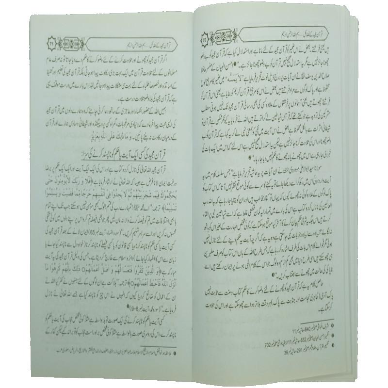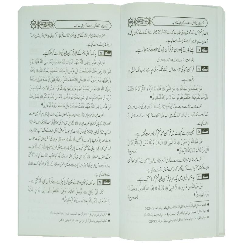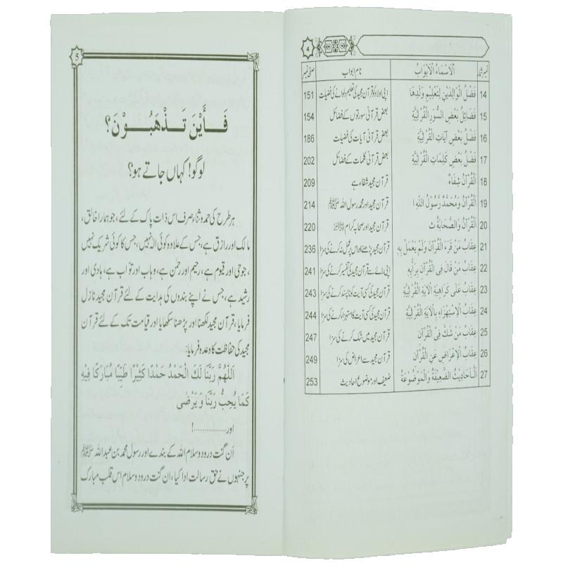 اس کتاب میں قرآن مجید کے فضائل، قرآن مجید پڑھنے اور پڑھانے کے فضائل، قرآن مجید زبانی زیاد کرنے کے فضائل، قرآنی سورتوں کے فضائل، قرآنی آیات کے فضائل، تلاوت قرآن کے آداب، قرآن مجید سے اعراض کی سزا، قرآنی احکام کو ناپسند کرنے اور استہزا کرنے کی سزا کے علاوہ بعض قرآنی سورتوں کے بارے میں ضعیف اور موضوع روایات کا ذکر کیا گیا ہے۔