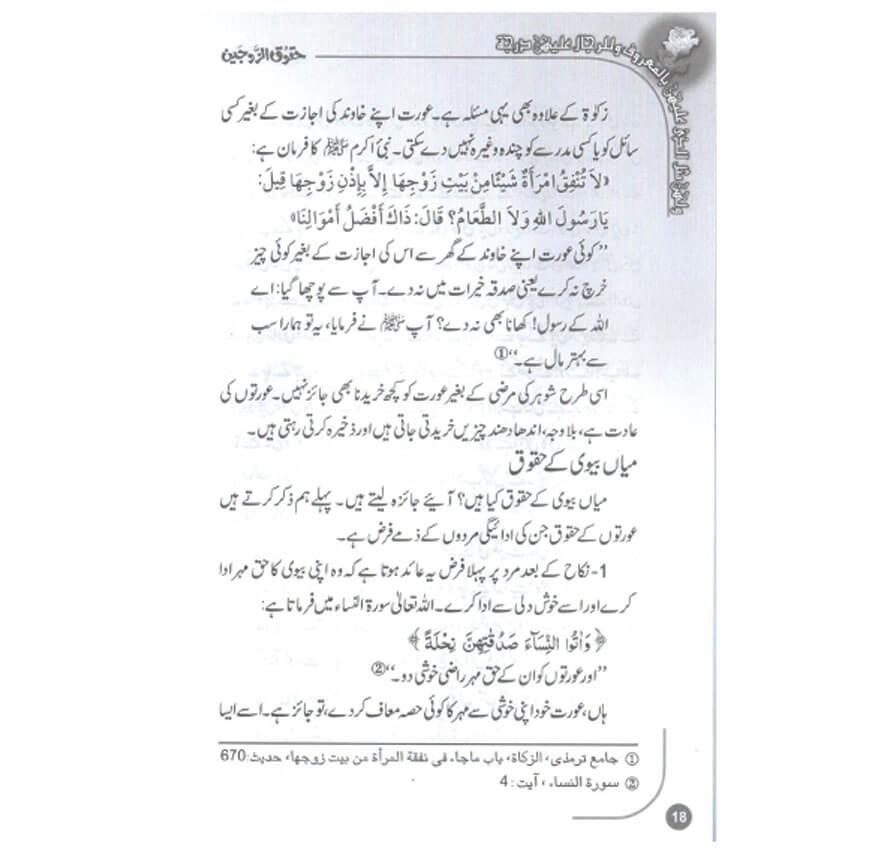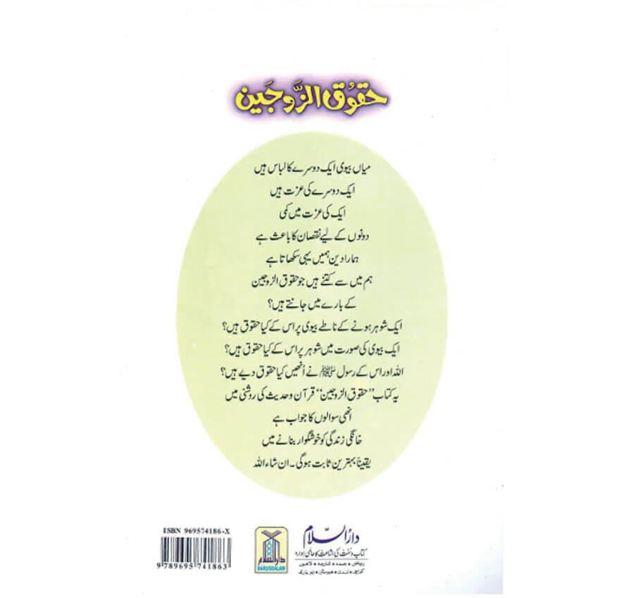 اسلام نے فرد اور معاشرے کی اصلاح ، استحکام، فلاح وبہبود اورامن وسکون کےلیے ہر شخص کے حقوق وفرائض مقرر کردیے ہیں۔اسلام کے بیان کردہ حقوق وفرائض میں سے ایک مسئلہ حقوق الزوجین کا ہے ۔ اسلام کی رو سے شادی چونکہ ایک ذمہ داری کانام ہےاس لیے شادی کےبعد خاوند پر بیوی اور بیوی پر خاوند کے کچھ حقوق عائد ہوتے ہیں جنہیں پورا کرنا دونوں پر فرض ہے ۔ میاں بیوی ایک دوسرے کالباس ہیں ایک دوسرے کی عزت ہیں ایک کی عزت میں کمی دونوں کےلیے نقصان کا باعث ہے ہمارا دین ہمیں یہی سکھاتا ہے۔زوجین اگر دینی تعلیمات کے مطابق ایک دوسرے کےحقوق خوش دلی سے پور ے کرنے لگیں تونہ صرف بہت سےمفسدات اور خرابیوں کا خاتمہ ہوجائے گا بلکہ ہمارا معاشرہ سکون وطمانیت کی پیاسی مادہ پرست دنیا کے لیےبھی امید اورآرام کی سبق آموز بشارت بن جائے ۔ حقوق الزوجین کےسلسلے میں قرآن وسنت میں واضح احکام موجود ہیں اور اس موضوع پر کئی اہل علم نے مستقل کتب بھی تصنیف کی ہیں۔ زیر تبصرہ کتابچہ ’’حقوق الزوجین‘‘ دینی کتب کے طباعت کے عالمی ادارے دارالسلام کی طرف سے شائع شدہ حقوق سیریز میں ایک ہے جسے مفسر قرآن جناب مولانا حافظ صلاح الدین یوسف نے بڑے احسن انداز سے مرتب کیا ۔ایک شوہر ہونے کےناطے بیوی پر اس کے کیا حقوق ہیں ؟ ایک بیوی کی صورت میں شوہر پر اس کے کیا حقوق ہیں؟ اللہ اوراس کے رسولﷺً نےانہیں کیاحقوق دیے ہیں۔ان تمام سوالوں کے جواب قرآن وحدیث کی روشنی میں اس کتاب میں موجود ہیں ۔