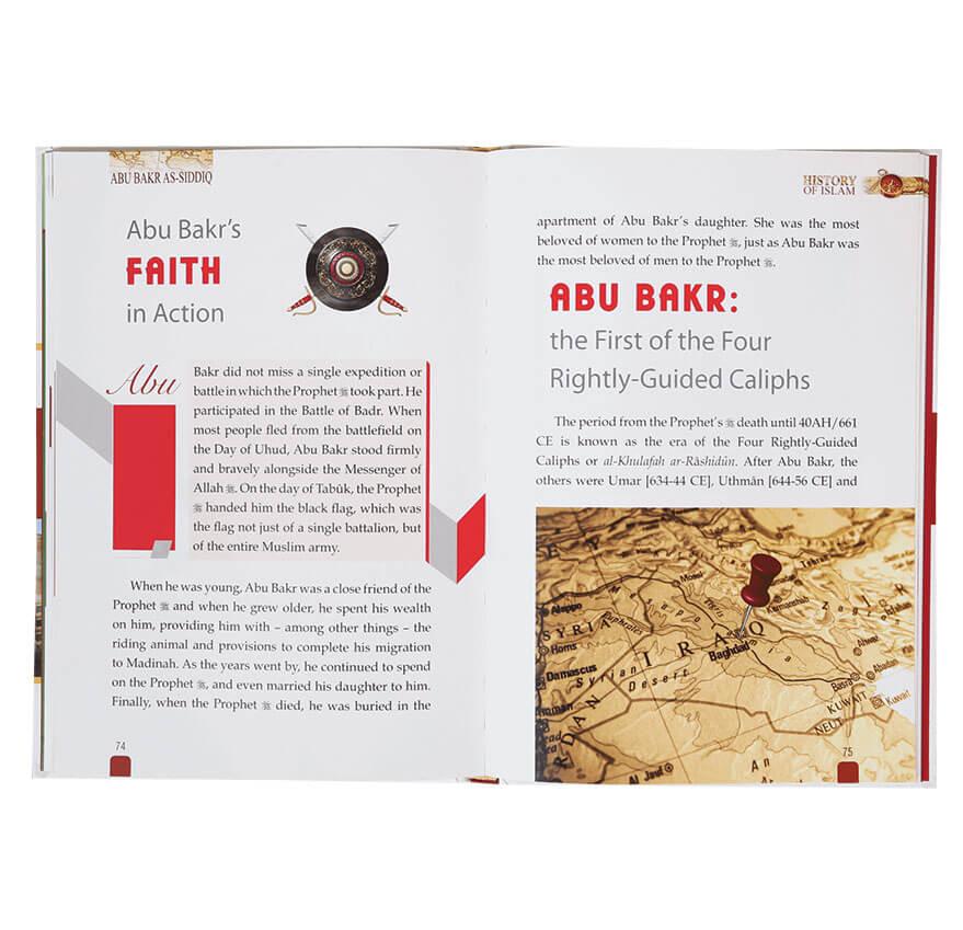 History of Islam, Age of the Rightly Guided Caliphs, Abu Bakr as-Siddiq (RA) is the first volume in the History of Islam series by Darussalam. This unique series of books is developed to provide Muslim youth with authentic information about the history of Islam and its glorious days. Written by Maulvi Abdul Aziz, the book has been divided into five chapters and features colorful illustrations, maps and real-time pictures of historic places and events that happened during the life of Abu Bakr as-Saddiq. The first chapter deals with the events that happened after the death of Prophet Muhammad PBUH, the second deals with the caliphate of Abu Baks As-Siddiq, the third informs the readers about the ancestry, titles, family and life of Abu Baks As-Siddiq and the final chapter highlights the spread of Islam and conquest of Iraq under the leadership of the first caliph of Islam.