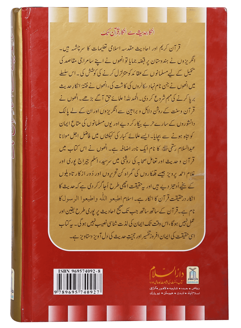 قران کریم اور احادیث مقدسہ اسلامی تعلیمات کا سر چشمہ ہیں۔ انگریزوں نے ہندوستان پر قبضہ جمایا تو انھوں نے اپنے سامراجی مقاصد کی تکمیل کے لیے مسلمانوں کے عقائد کو متزلزل کرنے کی کوشش کی۔ اس سلسلے میں انھوں نے جن نام نہاد سکالروں کی کاشت کی، انھوں نے فتنہ انکارِ حدیث برپا کرنے کی مہم شروع کردی۔ الحمدللہ ! علمائے حق آگے بڑھے۔ انھوں نے قران و سنت کے روشن دلائل و براہین سے انگریزوں اور ان کے لے پالک دانشوروں کے سارے حربے بیکار کردیے اور یوں مسلمانوں کی متاعِ ایمان کو تباہ ہونے سے بچایا۔ ایسے علمائے کبار کی کہکشاں میں فاضل اجل مولانا عبدالسلام رستمی کا نام ایک نادر اضافہ ہے۔ انھوں نے اس کتاب میں قران و حدیث اور تعامل صحابہ کی روشنی میں سر سید، اسلم جیراج پوری اور غلام احمد پرویز جیسے قلمکاروں کی گمراہ کن تحریروں اور دور ازکار تاویلوں کے بخیے اُدھیڑ دیے ہیں اور یہ حقیقت اچھی طرح اُجاگر کردی ہے کہ حدیث کا انکار در حقیقت قران کا انکار ہے۔
