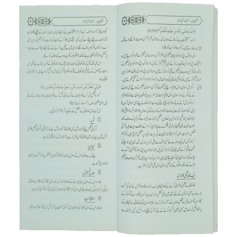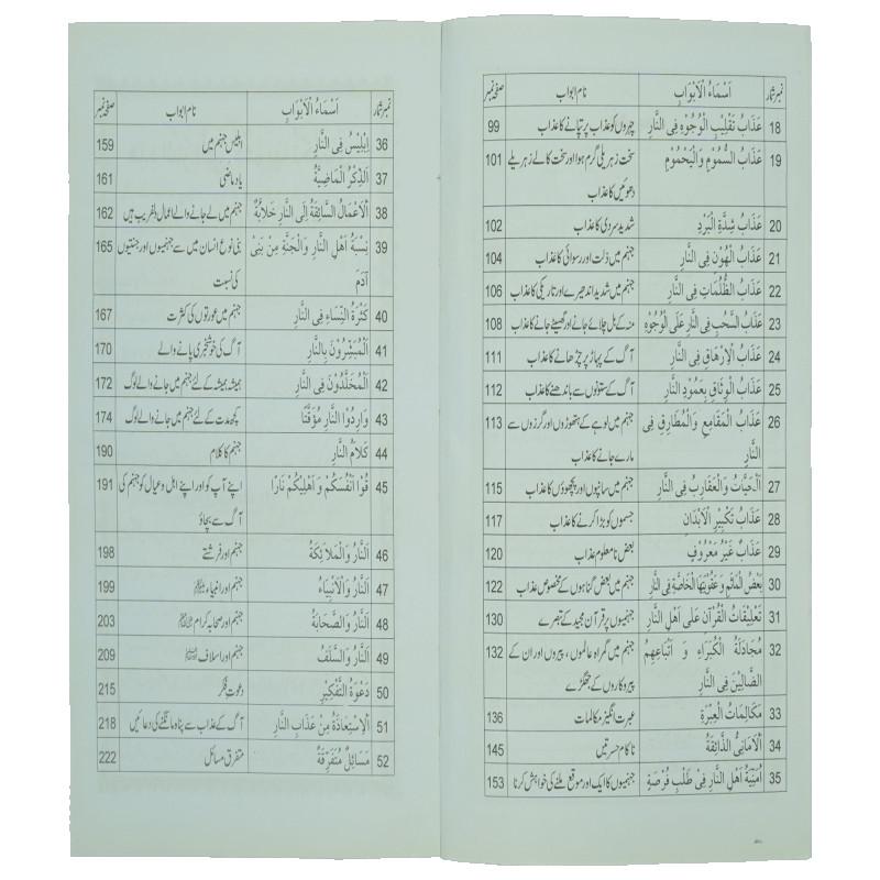 اس کتاب میں جہنم کے وجود کا ثبوت، جہنم کے دروازے اور درجات، ہلکا ترین عذاب، آگ کی شدت، اہل جہنم کا کھانا پینا، لباس، بستر، چھتریاں، قناتیں، ہتھکڑیاں اور بیڑیاں، نیز جہنم میں لوہے کے ہتھوڑوں، گرزوں، سانپوں اور بچھوؤں، زہریلی گیس اور زہریلے دھوئیں کے عذابوں کا ذکر قرآن مجید اور احادیث صحیحہ کے حوالے سے کیا گیا ہے۔