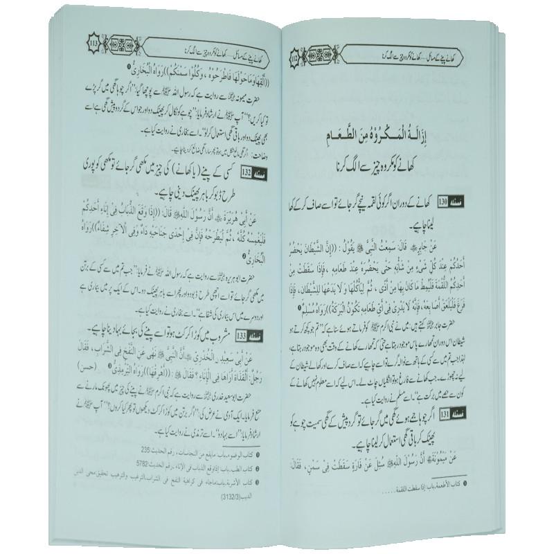 اس کتاب میں کھانے پینے کے آداب، رسول اکرم کے پسندیدہ اور ناپسندیدہ کھانے، کھانا کھلانے کی فضیلت، قربانی، ولیمہ، عقیقہ اور شکار کیے گئے جانور کے مسائل بیان کیے گئے ہیں، نیز حرام اور مشتبہ مأکولات و مشروبات سے بچنے، نیز کھانے پینے میں اسراف کی مذمت کے مسائل احادیث صحیحہ کی روشنی میں بیان کیے گئے ہیں۔ اہل کتاب کے برتن اور کھانوں کے بارے میں شریعت کے احکام واضح کیے گئے ہیں۔