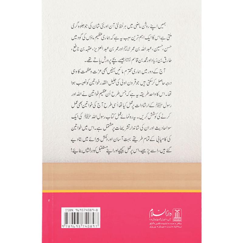 ہمیں اپنے روشن ماضی میں ہر لحظ نئی آن اور نئی شان کی جو جلوہ گری ملتی ہے اس کا ایک اہم ترین سبب یہ ہے کہ ہماری عظیم ماؤں کی گود میں حسن، حسین، عبداللہ بن عمر، اور عمر بن ابدالعزیز ،عقبہ بن نافع، طارق بن زیاد اور محمد بن قاسم جیسے بچے پرورش پاتے تھے۔ آج کے دور میں ہماری محترم مائیں بہنیں بھی عزت و عظمت کا وہی درجہ حاصل کر سکتی ہیں جو قرون اولیٰ کی جلیل القدر خواتین کو نصیب ہوا تھا۔ اس کا واحد طریقہ یہ ہے کہ جس طرح اُن عظیم خواتین نے اللہ اور رسول ﷺ کے ارشادات پر عمل کیا تھا اُسی طرح آج کی خواتین بھی عمل کرنے کی کوشش کریں۔ یہ رہ نمائے عمل کتاب رسول اللہ ﷺ کی ایک سو احادیث اور ان کی شاندار تشریحات پر مشتمل ہے۔ اس میں خواتین کی کامیابی کے تمام طریقے بہت آسان اور دلکش پیرائے میں بتا دیے گئے ہیں، اسے پڑھیے، اس پر عمل کیجیے، اور اپنے مستقبل کو درخشاں بنائیے۔