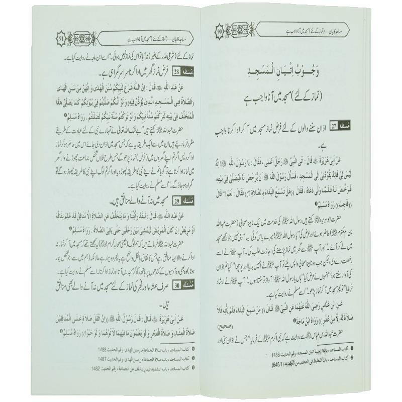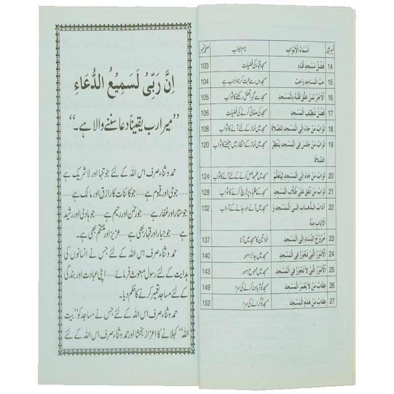اس کتاب میں مساجد کی تعمیر کا مقصد، مساجد کی تعمیر کا ثواب، معاشرے میں مساجد کی اہمیت، مساجد کی فضیلت، مسجد حرام، مسجد نبوی اور مسجد اقصیٰ کی فضیلت، مسجد قبا کی فضیلت، مساجد کی صفائی کرنے کی فضیلت، مساجد میں جائز امور اور ناجائز امور احادیث صحیحہ کی روشنی میں بیان کیے گئے ہیں۔