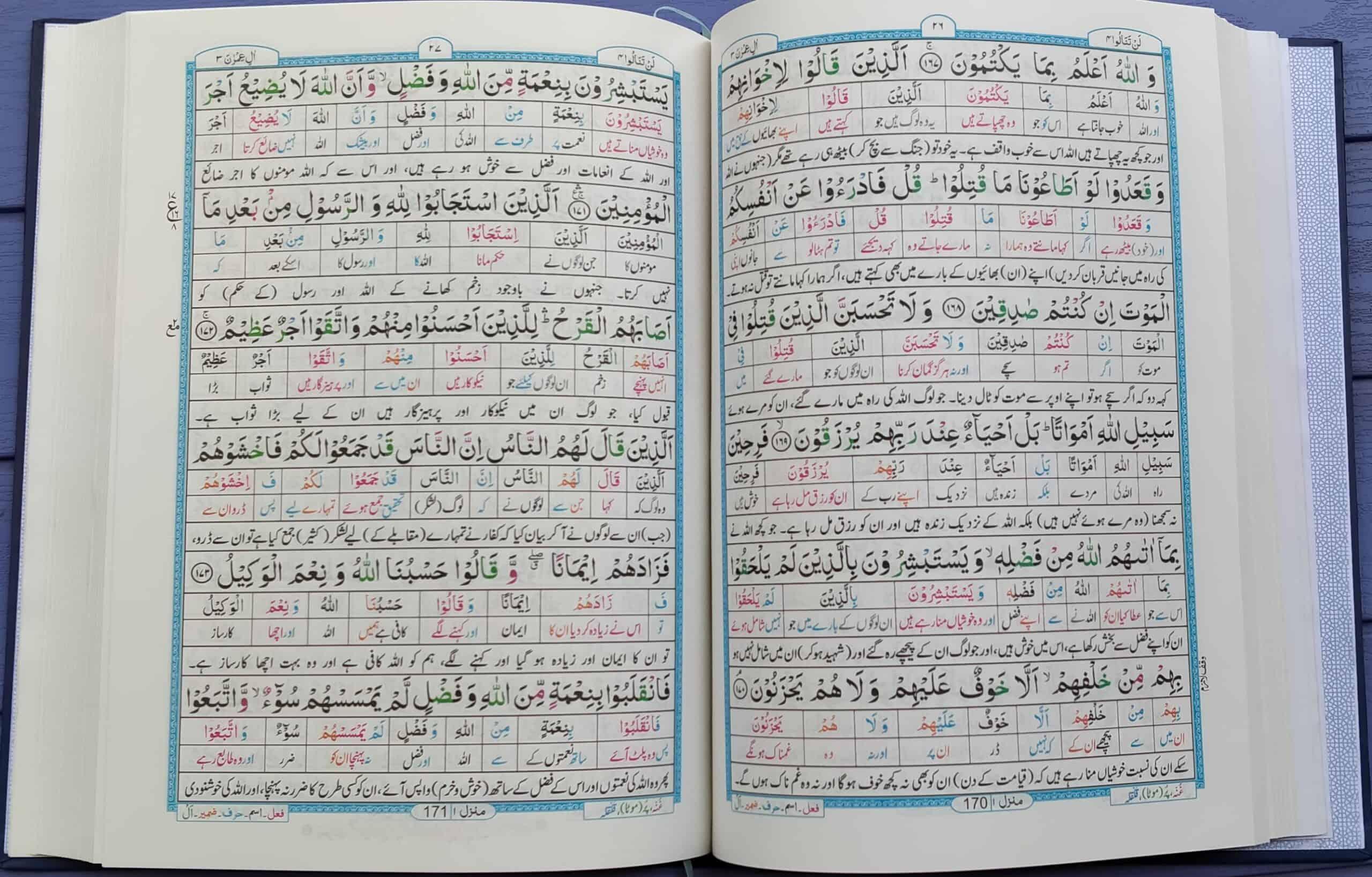 ۔دوسری اور تیسری سطر لفظی ترجمے کی ہے،یہاں الفاظ کو گرامر کی رو سے اسم، فعل ، حرف اور اسم ضمیرکیلئے متعین رنگ دیا گیا ہے جس کی وضاحت ہر صفحے کے نیچے بائیں جانب ایک بکس میںکی گئی ہے۔یہ رنگ عربی متن اور لفظی ترجمے دونوں کو دیا گیا ہے تاکہ مرکب لفظ کی صورت میں اصل لفظ یا صیغےکا ترجمہ واضح ہو جائے۔