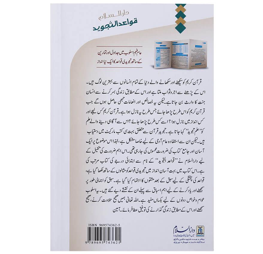 قران کریم کو سیکھنے اور سیکھانے والے دنیا کے تمام انسانوں سے بہترین لوگ ہیں۔ قران مجید کو پڑھنے کا صحیح طریقہ وہی ہے جس طرح وہ نازل ہواہے۔ قران کریم کس لہجے اور کس انداز میں نازل ہوا؟ اسے کس طرح پڑھا جائے؟ اس سے آگاہی دینے والے علم کو `علم تجوید` کہا جاتا ہے۔ تجویدِ قران سے متعلق بہت سی کتب مارکیٹ میں دستیاب ہیں۔ لیکن ان سے استفادہ عام آدمی کے لیے خاصا مشکل ہے، لہٰذا اس موضوع پر ایک آسان اور جامع کتاب کی ضرورت محسوس کی جا رہی تھی۔ اس اہم ضرورت کی تکمیل کے لیے دارالسلام نے `قواعد التجوید` کے نام سے ابتدائی درجے کی کتاب مرتب کی ہے۔