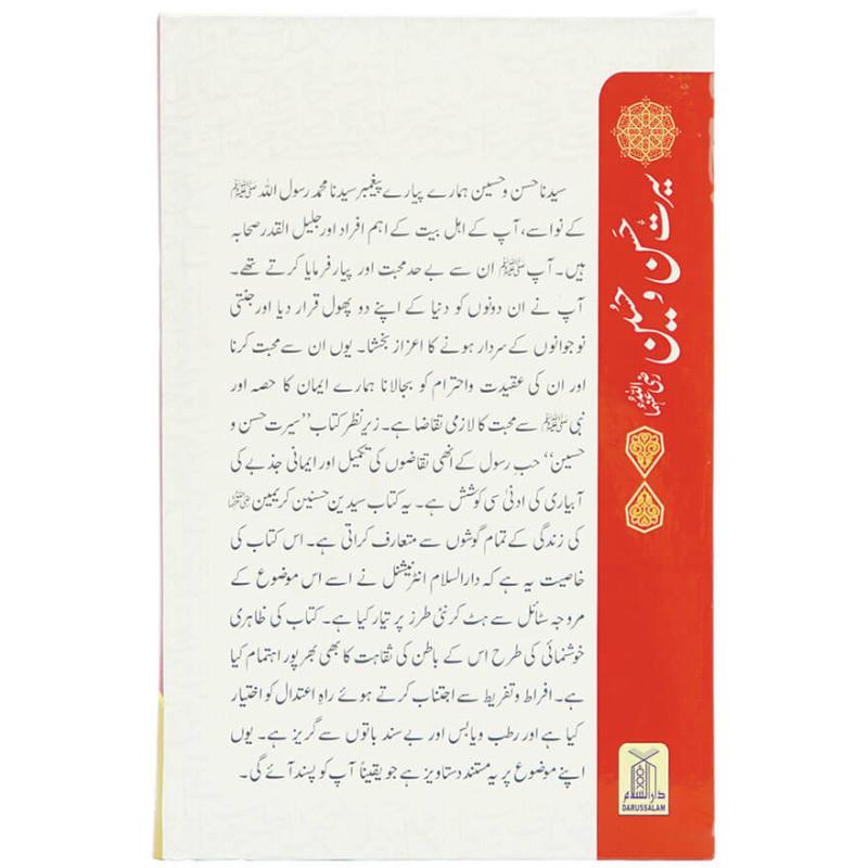 زیرنظرکتاب "سیرت حسن وحسین" حبِ رسول کے انھی تقاضوں کی تاکمیل اور ایمانی جذبے کی آبیاری کی ادنیٰ سی کوشش ہے۔ یہ کتاب سیدین حسنین کریمین رَضِیْ اَللّٰہُ تَعَالٰی عَنْہُ کی زندگی کے تمام گوشوں سے متعارف کراتی ہے۔