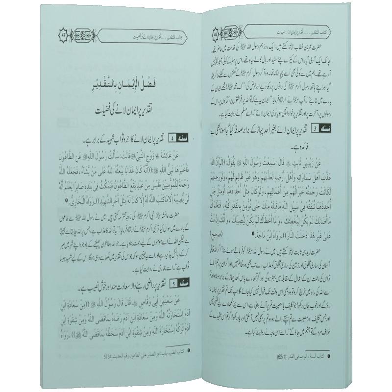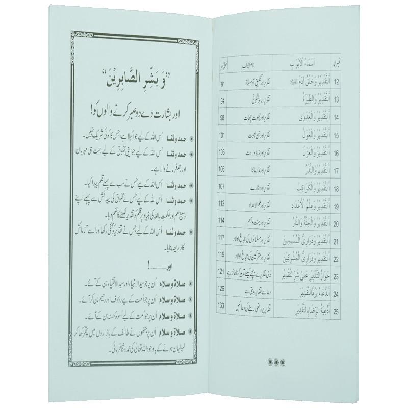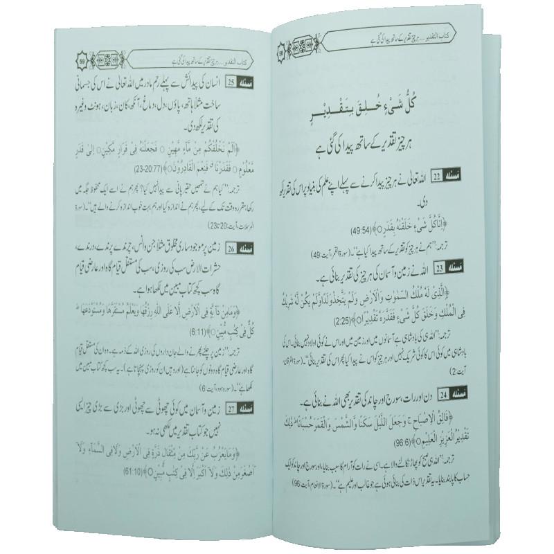 اس کتاب میں تقدیر پر ایمان لانے کا وجوب اور اس کی فضیلت، منکرین تقدیر کے بارے میں شریعت کا حکم، تقدیر پر بحث کی ممانعت کا حکم، نیز چھوت چھات، علم نجوم، علم الاعداد، ضبط ولادت، نذر اور بدشگونی وغیرہ کے علاوہ جنت اور جہنم کے بارے میں تقدیر کے مسائل اور احکام واضح کیے گئے ہیں۔