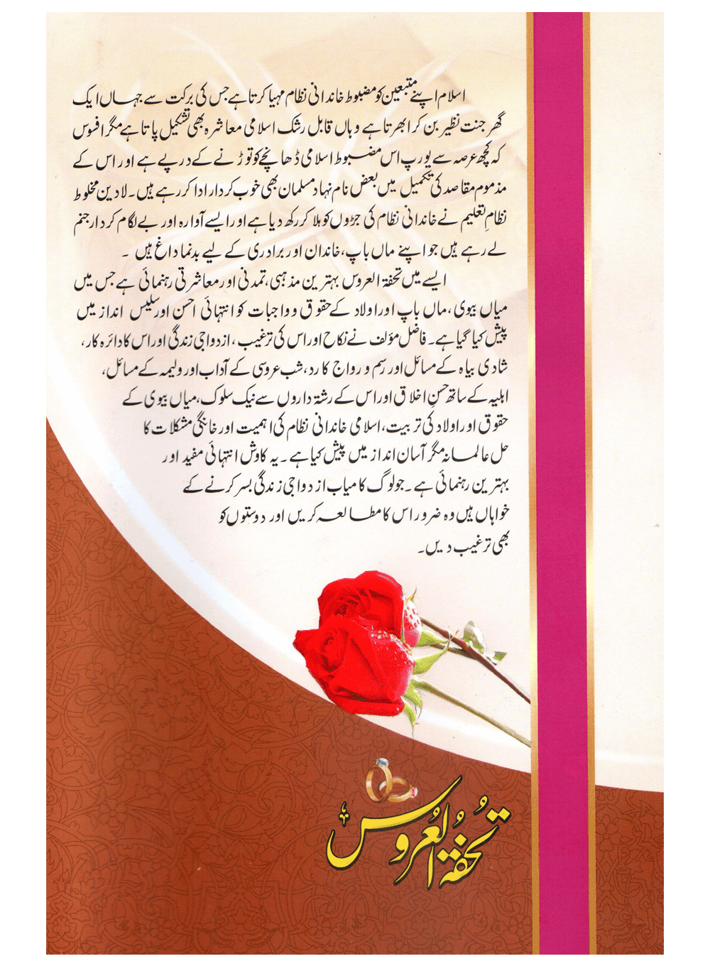تحفة العروس عصر حاضر کی مشہور و معروف کتاب ہے، جس میں ازدواجی زندگی جیسے اہم اور نازک مسئلے کو موضوع بحث بنایا گیا ہے۔ صاحب کتاب نے کمال مہارت کا ثبوت دیتے ہوۓ آیات، احادیث، آثار، تجربات اور مشاہدات کے ذریعے سے ازدواجی زندگی کے ان تمام پہلوؤں کو اجاگر کیا ہے، جنہیں عموما نظرانداز کر دیا جا تا ہے۔